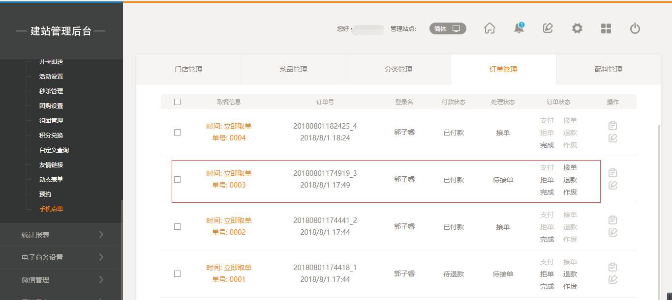 后台外卖订单界面