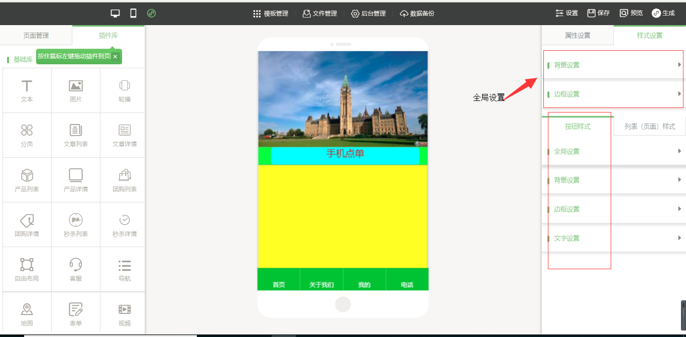 3.在小程序编辑器中,拖入插件“手机点单”,该插件为内页插件,我们可以在页面中给小程序页面进行布局,然后点击“开始点单”按钮进行属性及样式设置,由于需要店面的准确定位,因此需要申请地图的API密钥,具体操作可以看帮助文档,在样式设置中,“背景设置”与“边框设置”是全局设置,是针对该小程序插件页面的整体设置,“按钮样式”则是仅针对于“手机点单”入口按钮的设置;“列表(页面)设置”是针对该菜品列表页的设置,里面的“文字设置”中可以设置需要的显示项,设置完成之后点击保存即可(注:当后台没有添加任何数据时,该列表页中会出现一组假的数据,仅供参考使用,当后台添加数据之后,该列表会自动换成真实数据),如图所示: